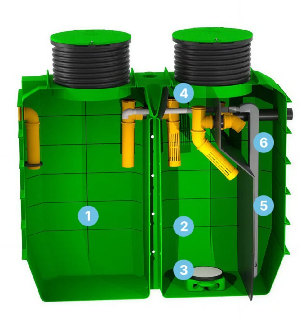Der PE-Behälter ist grundwasserstabil bis 1,12 m über Behälterboden und kann auch in entsprechenden Grundwasserverhältnissen eingebaut werden. Zusätzlich ist die Anlage PKW-befahrbar bis 3,5 t.