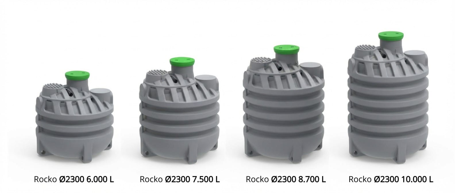 Der Rocko Ø2300 ist der größte Regenwasserbehälter der Rocko-Serie und eignet sich ideal für Anwendungen mit hohem Wasserbedarf, wie größere Wohnanlagen, Gewerbeobjekte oder landwirtschaftliche Nutzung.
