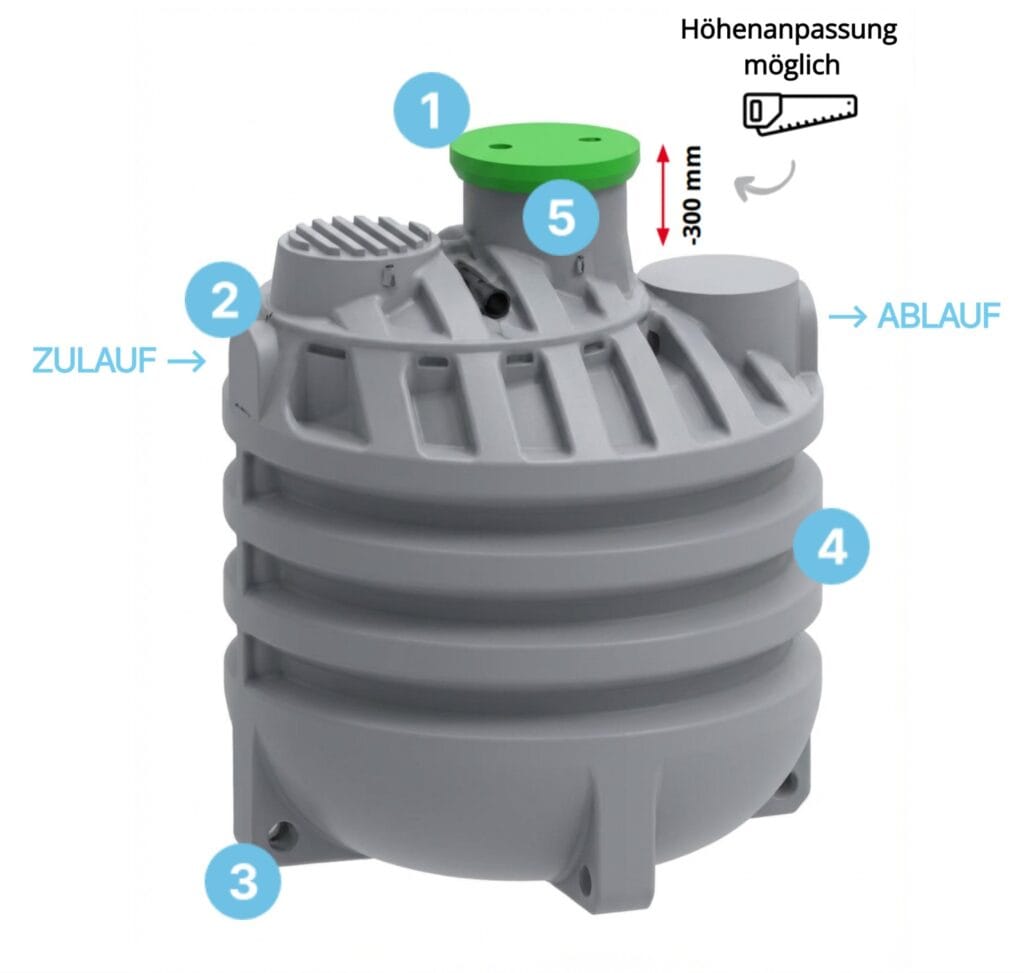 Der Behälter wird aus hochwertigem Polyethylen (PE) in einem Stück gefertigt. Dadurch entsteht eine vollständig wasserdichte, robuste und langlebige Konstruktion. Mit einer Wandstärke von 8–14 mm und stabilisierenden Verstärkungsrippen hält der Tank hohen Erdlasten sowie äußeren Belastungen stand.
