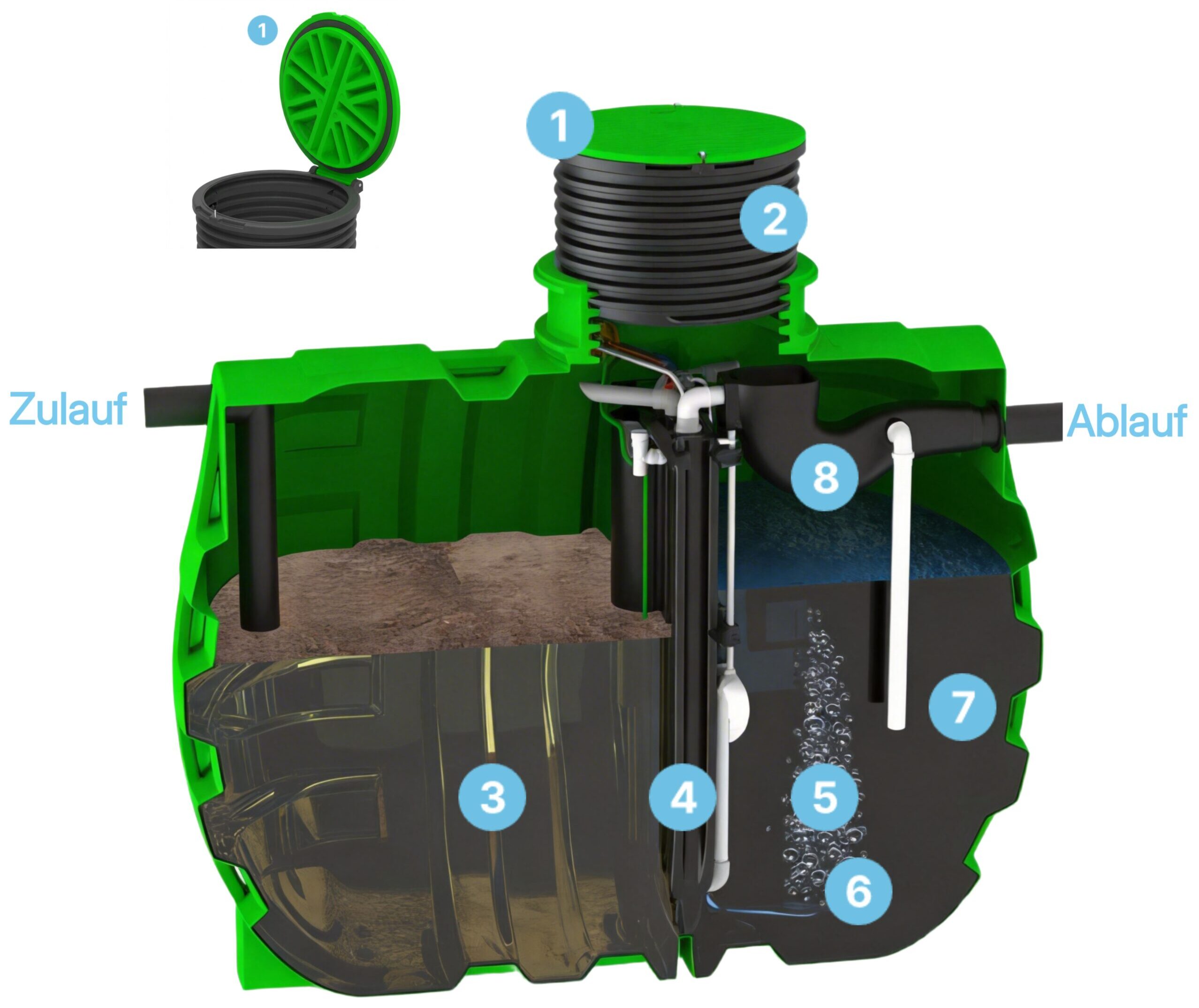 Die RoClean Kleinkläranlage nutzt das SBR-Verfahren (Sequencing Batch Reactor) zur biologischen Reinigung von Abwasser. Die Anlage besteht aus zwei Bereichen: